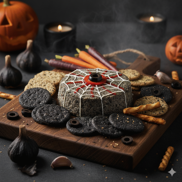 - „Kísérteties Szem”: Formázd a pástétomot egy lapos tálon vagy deszkán kör alakúra. A közepére helyezz egy fél, zöld olajbogyót, vagy egy vastagabb szelet fekete olajbogyót, mint pupillát. Köré szúrhatsz vékonyra vágott piros kaliforniai paprika csíkokat, mint „erek”.